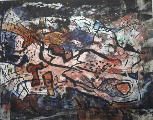 Scarlett’s acceptance into the Museum of Non-objective painting resulted in a close friendship with its founder, Hilla Rebay, and by 1940 Scarlett had become the new museum’s chief lecturer; within a decade the Guggenheim owned nearly sixty of his paintings and monoprints. With artists such as Rudolf Bauer also working at the Guggenheim, and Rebay offering their constructive criticism, Scarlett was guided through the Non-objective art world by the hand, but was never was blinded by their personal, artistic philosophies.