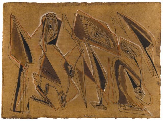 Trained first as a painter and draftswoman, Dehner's delicate drawings and watercolors are a prelude to her work as a sculptor. These works draw upon the primitive, calligraphic nature of oriental art and represent the possibilities available to an artist. They suggest an “affinity with the understated aesthetic of Paul Klee with each line, color and form emphasizing both a visual and a symbolic isolation” [Grove].